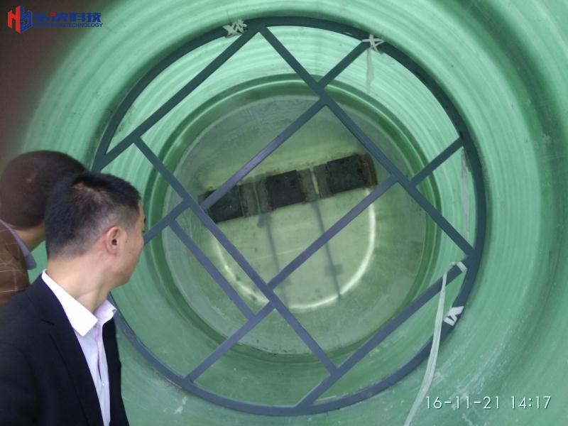 一體化污水提升泵站本體是采用玻璃鋼纖維機械纏繞工藝,外形為圓筒形,,針對項目需要處理的污水量制定筒體的直徑和高度。在筒體上分別留有進水口和出水口,分別和管網(wǎng)連接,污水或雨水通過市政管路自流入泵站玻璃鋼筒體,筒體內(nèi)設(shè)有壓力傳感器或者液位傳感器系統(tǒng),當液位達到一定高度的時候傳感器將信號傳送到控制系統(tǒng),控制系統(tǒng)控制潛污泵啟動。潛污泵啟動后將污水通過不銹鋼壓力管道提升到泵站筒體的出水口,泵站出水口和市政管網(wǎng)連接,污水進入管網(wǎng)后排放到污水處理站。當筒體內(nèi)水位下降到一定液位后控制系統(tǒng)發(fā)出停泵信號,水泵停止。如此周而復始,為一體化污水提升泵站的整個運行流程。