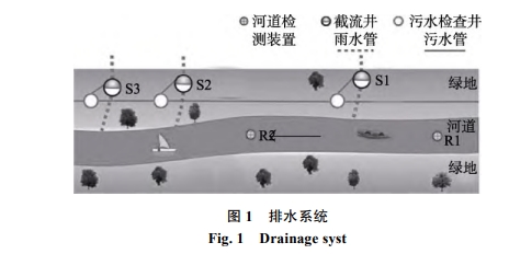 本次研究區域為日市主城區內的部分河段全長 310m,南北走向,地處亞熱帶區域,年降雨量在1400~2 000mm,最大徑流量出現在5至9月。河寬為 20~30 m,河道平緩,流速低,河道常水位 3.0 m,水深常年穩定在 1.5 m左右,河道東岸人口密集,以住宅區和餐飲行業為主。河道東岸沿河鋪設截污管道,東岸管徑800mm,管道流向由北向南。雨水管由市區內通向河道,通過管道末端設置截流井連接河道排口,見圖1。