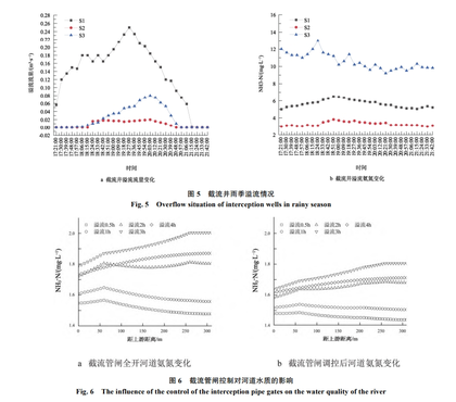 通過對5日旱季截流井水質連續24h的監測:發現旱季時 S1、S2、S3 對應于三口井的時均氨氮濃度達 6.4、3.0、10.1mg幾,可知,三口井內均有不同程度的污水進人,無法達到直排標準,說明該區域雨污分流改造存在問題,依然有污水流人雨水管中。三口井均未發生溢流,可知截流井內水體從截流管中流走,截流并在旱季時能起到截污作用。