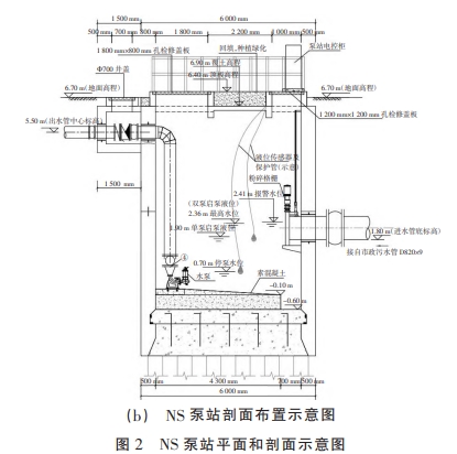 NS 泵站采用矩形布置,占地面積約 49 m。泵站整體采用鋼筋混凝土箱體結構,LxBxH=6.0 mx7.0 mx7.5 m,泵站采用全地埋形式,設置3類檢修孔,分別為水泵檢修孔 LxB=1.8 mx0.8m、清淤孔 Ф700、格柵檢修口 LxB=1.2 mx1.2m,平面和剖面布置示意圖如圖 2所示。為避免同一區域開挖大基坑,泵前檢修閘門設置閘站上游 20m污水檢查井內,采用圓形閘門,無漏出地埋的操作桿。