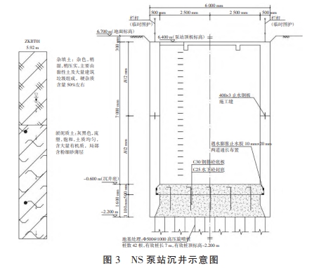 CZ 泵站和 NS 泵站沉井有一定的相似性。以 NS泵站為例,沉井尺寸 LxBxH=6.0 mx7.0 mx7.5 m,采用直壁式側壁,側厚度 500 mm,底板厚 500 mm。采用“不排水下沉”法,水下素砼封底厚1100 mm,主體結構采用 C30 混凝土,封底采用 C25 混凝土。地質揭露存在淤泥質土,地基處理進行 Ф500@1 000 高壓旋噴樁處理。NS 泵站下沉開挖土層主要為填土、淤泥質土,無鄰近需保護建構筑物,不未設擋土周樁。NS 泵站底板與側壁之間的止水措施采用2道遇水膨脹止水條,效果較好。做法如圖3所示。