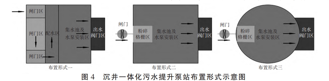 3.4.1 泵站的集約化布置經對比研究,沉井式一體化污水提升泵站主要有以下3種布置形式(圖4),其中布置形式一采用回轉式機械格柵,將格柵及格柵檢修、泵站檢修閥門設置在沉井內部,通過內部隔墻分為不同的功能區,不同功能區的高程差異通過素混凝土二次填充實現;布置形式二和布置形式三均采用粉碎格柵,將格柵安裝在沉井內壁,將泵站檢修閥門井設置在沉井外的第一個污水檢查井內,相比布置形式一,布置形式二和布置形式三用地更加集約。3種布置形式的共性是閥門井二次施工澆筑。本研究案例中的CZ泵站屬于布置形式一、NS泵站屬于布置形式二,從實際設計來看,雖然 NS 泵站規模遠大于 CZ 泵站,但得益于粉碎格柵的使用,NS 泵站占地面積比 CZ 泵站更小,。