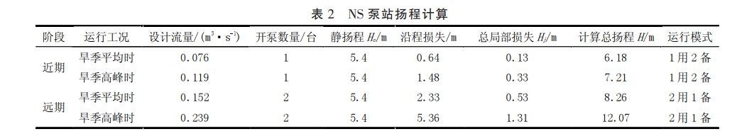 水泵揚程確定是水泵選型的重要考慮因素,水泵的揚程主要由靜揚程、沿程損失和局部損失構成,此外,為保障水泵運營安全,一般預留一定的富余水頭。在計算水泵揚程時,應分別按近期、遠期的旱季平均和旱季高峰等工況進行計算,按最大值選取水泵。當計算的水泵揚程過高時,應通過調整出水管管徑的方式降低流速,從而降低揚程。在計算沿程損失時,應采用海曾威廉公式計算。以 NS泵站為例,不同工況下,揚程計算結果詳見表2,計算泵站揚程在6.18-12.07m,考慮最不利工況揚程為 12.07m,預留2m左右富余水頭,最終選取水泵揚程 日=14m。在選用水泵時,優先選擇帶切削功能的變頻泵。當泵站服務分區內存在合流區時,還應考慮雨季運行工況下揚程的復核。