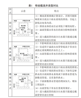 傳統截流井可以直接在現狀排水口進行改造,且不需要設備,造價低,運行管理方便,在一定時期內得到了廣泛推廣。但其也存在不少弊端,主要如下:①降雨初期通過截流管進入污水系統的混合污水量和水質都不穩定,污水量增大且含有大量無機物,不利于污水處理廠的運行:②截流管管口的格柵很容易被雜物堵塞,造成污水溢流,對水體造成一定程度的污染:③中、大雨期間,管涵內以雨水為主,導致進入截流管道的污水濃度偏低,嚴重影響污水處理廠處理效果:④下游受納水體水位的標高一旦超過溢流口的底標高便會倒灌,導致進入污水處理廠的污水量增加,增加污水處理廠負擔,甚至影響其運行:⑤采用堰式截流井的堰頂高程如高于當前合流排水管涵的底高程,還可能造成上游低洼區域積水而引發內澇。不同類型的傳統截流井特點詳見表1。