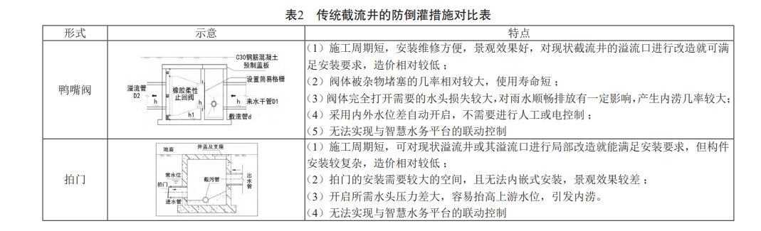 鴨嘴閥和拍門是傳統截流井常用的防倒灌設備但其打開需要一定的水頭損失,密閉性能不好,也無法通過水位或水質控制設備的自動啟閉,存在一定的風險。鴨嘴閥還存在易被雜質堵塞、使用壽命短的問題,裝在沿海城市排海口上的拍門還會因海蠣等生物附著生長而失效。