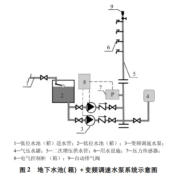 (3)保障消防系統。對于生活消防合用的供水系統,為避免影響消防系統的正常運行,應盡量避免改造中牽動消防系統。水池生活消防合用時,若泵房空間充足,優先考慮單獨設置生活水箱,反之優先考慮疊壓供水方式;水泵生活消防合用時,優先考慮重新設置生活水泵,將原水泵留作消防用。2.2 地下水池( 箱)+ 變頻調速水泵供水由水泵從地下水池(箱)取水,通過變頻器改變供電頻率控制水泵電機轉速,使水泵轉速和流量可調節,由水泵、控制柜(含變頻器)、壓力檢測儀表、管路、閥門等組成,如圖2所示