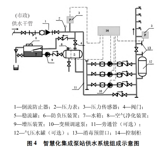 智慧化集成泵站整體形式與箱式疊壓較為相似,市政來水進入一體式水箱,變頻泵抽取水箱內生活用水并加壓向用戶供給,控制柜中設有更新程序,定時循環低位水箱中的水,保障飲水安全。系統主要由低位水箱、主泵機組、變頻控制柜、增壓裝置、引水裝置、穩流罐、流量控制器及壓力傳感器等組成。智慧化集成泵站供水系統的基本組成如圖4所示。