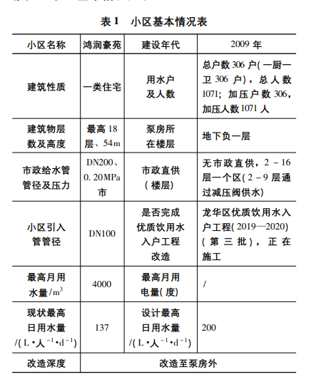 3.1 小區泵房情況評估本次給水改造各個小區分散各自獨立,各小區設計范圍較小,采用居民生活用水定額預測方法進行計算網,本設計案例小區為龍崗區樟富南路鴻潤豪苑,小區基本情況見表1。