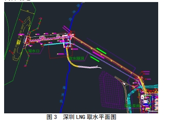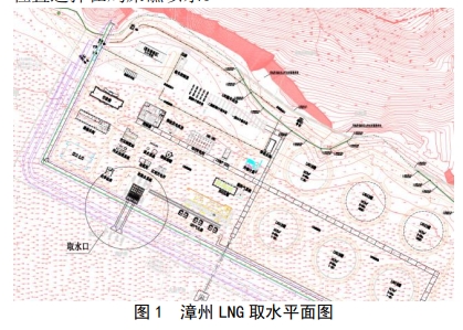 按照深圳 LNG 項目的總體規劃,海水取水口布置在港口碼頭棧橋的東南側海岸邊,此處地形特點是海岸陡峭,巖石山體下即為大鵬灣海域,水面以下海底坡度較大,在距海岸邊 170m 左右即為海域的深水區。取海水泵房布置在接收站西北角,此處距離海水出口閘門井最近。