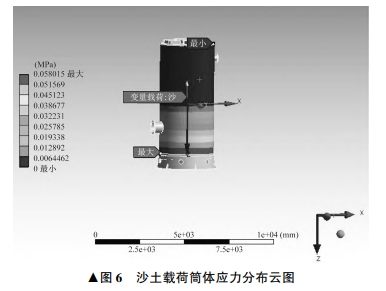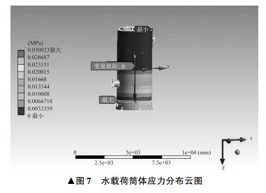 式中:ρ1 為沙土密度,取 1 900 kg / m 3 。 沙土對筒體壁面和底座底面施加載荷,筒體荷載 后的應力分布云圖如圖 6 所示。 由圖 6 可見,筒體外 壁面受力自上而下逐漸增大,筒體外壁面接近底座處 受到的應力最大,為 0. 058 015 MPa。 筒體內部有水時,筒體內部受到的壓力P2與水的深度 h2 有關,為: P2 = ρ2 gh2 (2) 式中:ρ2 為水的密度,取 1 000 kg / m 3 。 筒體加水至啟泵液位,高度為 3 400 mm,水對筒 體壁面和底面施加載荷,筒體壁面荷載后的應力分布 云圖如圖 7 所示。 由圖 7 可見,筒體壁面受力自上而 下逐步增大,筒體壁面接近底座處受到的應力最大,為 0. 030 023 MPa7