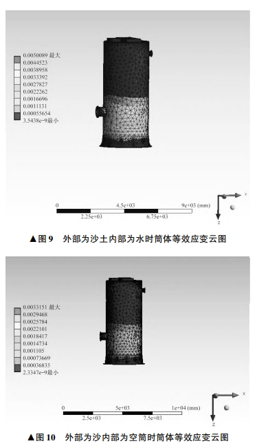 第二強度理論認為材料破壞的主因是最大伸長應變,當達到拉伸極限時材料會出現斷裂。簡體外部為沙,內部為水時的等效應變云圖如圖9所示,最大等效應變出現在進口管道和底座附近區域,最大等效應變值為0.0050089.與筒體相比變化極小,不會出現斷裂的危險。