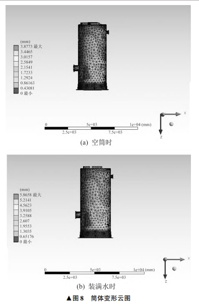 剛度指材料或結構在受力時抵抗彈性變形的能力,是材料或結構彈性變形難易程度的表征。材料的剛度通常用彈性模量來衡量。在宏觀彈性范圍內,剛度是零件荷載與位移成正比的比例系數,即引起單位位移所需的力。剛度的倒數稱為柔度,即單位力引起的位移。剛度可分為靜剛度和動剛度。通常采用材料在一定受力下的變形量大小來校核材料的剛度是否滿足要求。簡體在不同條件下的變形云圖如圖8所示當筒體內部為空筒時,簡體最大變形量為3.8733mm。當筒體內部為水時,簡體最大變形量為5.8658mm。