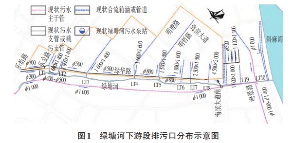 綠塘河下游段南側已建污水主管,上游接駁人民大道污水主管,沿綠塘河南側敷設,污水管管徑為1000~01 200,管道長約3.5 km,下游接駁海景路污水主干管,綠塘河南側沿線污水排口均已進行截流改造,未出現晴天污水溢流的現象。北側沿綠華路已建成污水支管,起點為樂怡路,沿線接駁樂金路、明理路明哲路等污水支管,終點于海濱大道處接入南側污水主管。因北側已建污水管網存在大量錯、混、漏接,導致現狀雨水管(渠)均變成合流管(渠)即使在晴天,仍有大量合流污水溢流至綠塘河,導致水體黑臭。