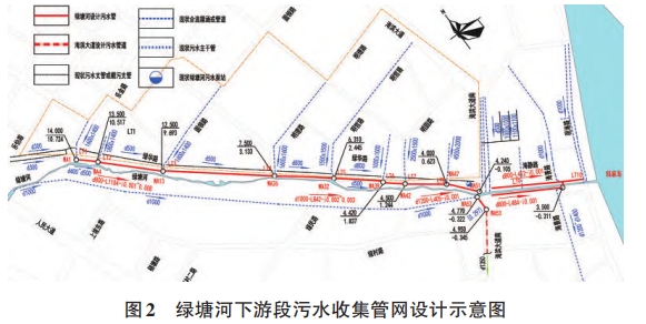 本項目治理目標為工程實施后實現晴天污水不入河,雨天污水少溢流,基本消除水體黑臭的考核要求。結合項目考核目標,以問題和目標為導向,通過梳理綠塘河主要污染來源,分析黑臭水體的成因,從流域綜合治理視角出發,遵循“源、廠、網、河”系統性思維,提出控源截污、暗渠清污分流9、河道清淤、活水保質、生態修復等綜合治理措施。綜合考慮現狀污水收集設施、項目投資、工程可實施性等因素,在控源截污措施方面設計擬沿綠塘河北側新建污水主管,分別接入海濱大道、海景路污水主干管,沿線污水直排口接駁進污水主管,合流排污口通過設置截流井的方式收集合流污水及初期雨水,如圖2所示,