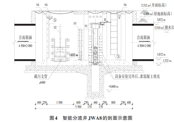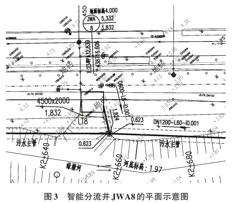 現以排污口LT8截流改造為例,說明智能分流井在排口改造中的應用。如圖3、圖4所示,現狀排水口尺寸為 BxH=4 500 mmx2 500 mm,原建設為雨水箱涵然而現狀卻是晴天仍可見污水排出。通過地下管線探測及排水溯源摸查,發現上游存在多處錯、混接的情況。受項目建設范圍、內容、資金及工期等綜合因素的限制,方案論證時建議近期完成排污口的合流制截流式改造,遠期逐步完善雨污分流改造。排污口改造措施為箱涵末端處設置下開式堰門的智能分流井JWA8,近期將箱渠內的污水截流至污水主管,待遠期完成上游雨污水錯混接改造,并結合綠塘河綜合治理措施實施后,實現雨天時將初期雨水截流至污水主管。JWA8下開式堰門分流井進出水管渠尺寸為4500mmX2 500 mm,井底標高維持原標高1.83m。根據其匯水面積范圍預測的污水量及截流倍數計算確定截流管管徑,管徑不宜取值過大,避免截流量遠超設計值,影響污水主管上下游污水收集,計算復核設計截流管管徑為DN600。下開式堰門的頂部標高(4.53 m)應大于河道的防洪標準的高水位標高(3.69m),減少極端天氣導致的河水倒灌現象。