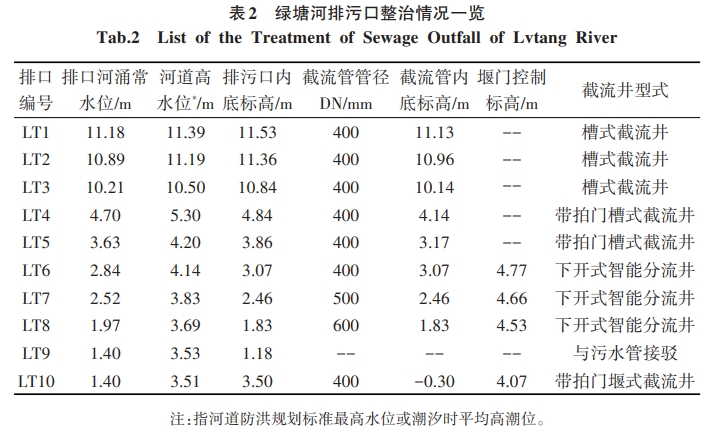 沿河排污口截流井的選擇是控源截污重要措施之一,對流域治理效果的影響至關重要。根據綠塘河下游段排污口的服務范圍、斷面尺寸、管(渠)內底標高、河涌水位、潮位影響等因素,設計截流井選擇需綜合考慮多項因素,選取合理可行的截流井形式。LT1~LT3排污口,內底標高均在歷年高潮位8.0m以上,即使在降雨且受潮位頂托時,河水倒灌的幾率極低,可選擇槽式截流井。LT4~LT5 排污口,內底標高在平均高潮位3.51m之上,在歷年高潮位8.0m以下,日常受潮位影響較小,但在降雨且受潮位頂托或天文大潮時,存在河水倒灌風險,可選擇帶拍門的槽式截流井或智能分流井LT6~LT8排污口,內底標高在平均高潮位3.51m之下,選擇槽式截流井時河水倒灌的幾率極高,尤其是 LT7、LT8排污口斷面尺寸較大,河水倒灌時,對污水主管水質水量的影響較大,容易導致上下游污水主管冒溢的現象可選擇智能分流井或堰式截流井,但是選擇堰式截流井在雨天時易導致上游內澇。LT9為污水直排口,應予以封堵,將污水就近接人市政污水管網。LT10內底標高在平均高潮位3.51m之下,應選擇智能分流井或堰式截流井,然而受周邊建設用地限制,只能選擇堰式截流的方式將污水收集至污水管網。因此,各排污口的截流井設計選型如表2所示。