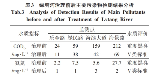 工程實施后,綠塘河下游段沿河的污水直排口實現晴天污水不人河,雨天污水少溢流,水體黑臭現象基本消除的治理目標,順利通過廣東省及生態環境部的考核評估。通過表3項目實施前后的監測數可知,水質得到極大的改善,由重度黑臭提升至V類水標準。