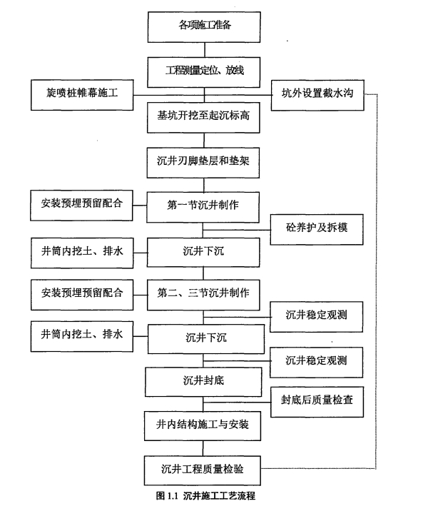 結合具體的沉井施工案例,從沉井施工的三個主要進程進行闡述。選擇沉井開挖方式,使用旋噴樁進行施工并采取措施進行質量和安全保證,選擇排水下沉方法,制作井筒,進行沉并下沉糾偏之后再進行沉井封底。同時,針對本工程案列可能遇到的問題進行研究,并提出相應的措施,對施工材料質量和隱蔽工程的質量進行保護。最后我們針對工程施工的安全問題進行考慮,做到安全與文明施工,并且制作施工應急預案來保證安全施工。