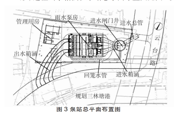 在泵站內(nèi)設(shè)置獨立管理用房,其內(nèi)配置會議室、辦公室、休息室、茶水間、衛(wèi)生間及浴室等設(shè)施。為保證雨水泵站出水條件良好,管理用房采用“L”形,避讓出水箱涵。泵站總平面布置圖見圖3.