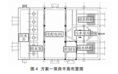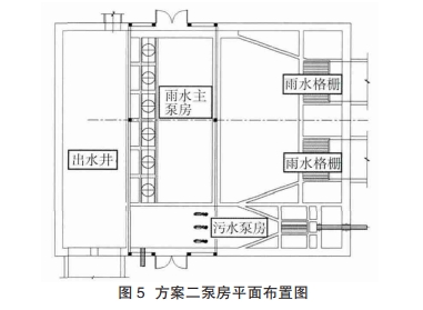 方案二。雨水泵房為雨水直進側(cè)出的矩形泵房,在雨水泵房外側(cè)設(shè)置污水截流泵房,側(cè)向出水。主泵房上部設(shè)置設(shè)備間、變配電間及控制室(見圖5)。