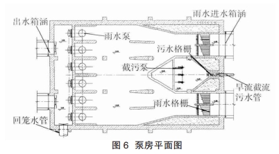污水截流泵房設(shè)置在雨水泵房中間,在雨水格柵井、污水截流設(shè)施格柵井處設(shè)置封閉式臭氣收集罩。格柵間散發(fā)的臭氣收集后,經(jīng)處理達標(biāo)后排放。泵房平面圖見圖6
