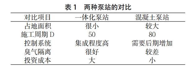 如今,新型的一體化泵站正有取代傳統(tǒng)的混凝土泵站的趨勢(shì)。一體化泵站的設(shè)備較為集成,雖然投資較高,但是運(yùn)行自動(dòng)化程度也高。由于混凝土泵站內(nèi)部的電氣、控制、工藝等,其投資較為節(jié)省,而且操作簡(jiǎn)單,很多建設(shè)單位考慮了投資的力度和產(chǎn)出之間的關(guān)系后,往往愿意建設(shè)傳統(tǒng)的泵站工程。兩種泵站各有優(yōu)勢(shì),也各有缺點(diǎn),如表1所示進(jìn)行具體的建設(shè)選型時(shí),人們需要結(jié)合當(dāng)?shù)氐慕?jīng)濟(jì)情況、泵站的選址以及施工周期等要求。