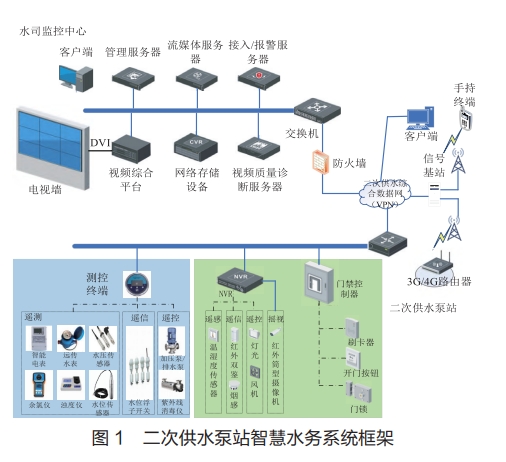智慧水務(wù)是智慧城市中非常重要的組成部分,作為城市供水管網(wǎng)重要節(jié)點(diǎn)的高坪偏遠(yuǎn)地區(qū)供水加壓泵站智慧化運(yùn)行更是實(shí)現(xiàn)智慧城市的基礎(chǔ)保證。通過對(duì)二次供水相關(guān)主管部門調(diào)研,并結(jié)合各地水司二次供水泵站接收管理規(guī)范,日常管理中的主要需求包括:在二次供水有限公司建設(shè)監(jiān)控中心以監(jiān)視泵站情況實(shí)現(xiàn)集中維護(hù)、每個(gè)泵站安裝視頻監(jiān)控設(shè)備監(jiān)控供水設(shè)備允許狀態(tài)、遠(yuǎn)程監(jiān)視泵站視頻圖像、監(jiān)視異常情況(門禁開啟、人員入侵、火災(zāi)報(bào)警、泵站溫濕度)、遠(yuǎn)程控制(燈光排風(fēng)、門禁等)開關(guān)、監(jiān)視水池水位流量等信息、泵站供電電流電壓等信息、遠(yuǎn)程控制供水系組的啟停等。