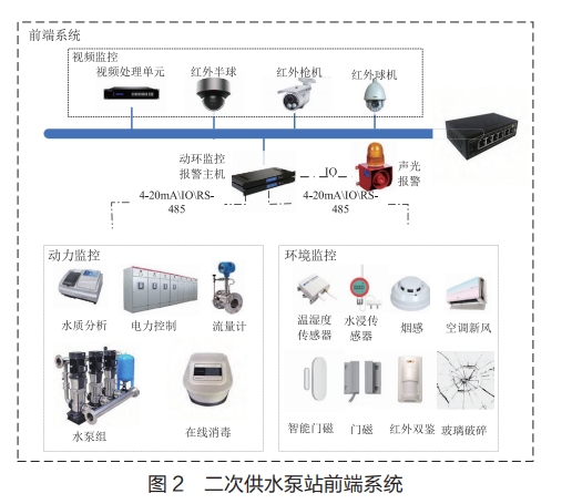 在二次供水泵站的前端系統(tǒng)中有視頻處理單元、紅外設(shè)備等監(jiān)控子系統(tǒng),水質(zhì)分析、流量計(jì)等動(dòng)力監(jiān)控子系統(tǒng),各類傳感器、空調(diào)等環(huán)境監(jiān)控子系統(tǒng),門碰等門禁控制子系統(tǒng),這些子系統(tǒng)構(gòu)建為完整的前端系統(tǒng),其架構(gòu)如圖2所示。