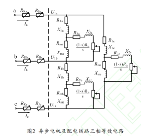 三相異步電機的核心由三相繞組構成,采用異步電機單相T型等效電路]三角形連接表示的異步電機三相等效電路如圖2虛線右側所示。圖2中R、X為電機定子繞組的等效內阻和感抗:R石為電機轉子繞組及負載換算到定子側的等效內阻和感抗:R、X為電機等效勵磁內阻和勵磁感抗;虛線左側表示配電線路的等效電路。