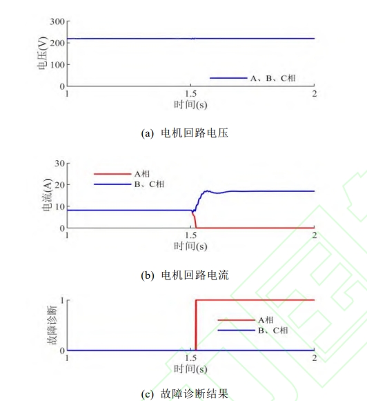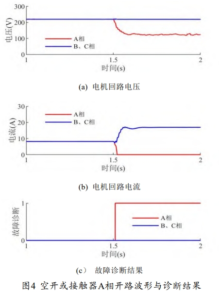 從圖 4 中可以看出,在 1-1.5s,電機端電壓均 維持在 220V 左右,回路電流為 8.2A,電機平穩運行,回路空氣開關或接觸器正常;t-1.5s時,空氣開關或接觸器A相觸頭發生開路故障,。下降其偏差滿足式(11),下降且滿足式(10),h和上升,使得電機三相電壓不平衡、三相電流不平衡,得到故障診斷結果為A相為1,其它相為0.
