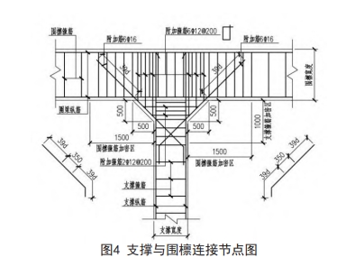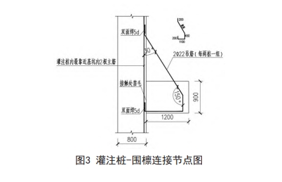 根據設計圖紙提供的坐標計算出圍檁交點處坐標,采用挖機開挖溝槽,待圍檁處的土體開挖結束后,澆筑墊層,墊層采用100mm厚C20素砼,寬度以大于圍或支撐寬度200mm為準。圍檁及支撐的鋼筋嚴格按照設計圖紙要求的規格型號、間距等進行加工及安裝,縱向主筋采用機械連接。第二道砼圍檁施工時,灌注樁內側鋼筋進行剝皮,出主筋,鋼筋砼圍檁通過吊筋與注樁主筋相連,吊筋采用222(每兩樁一組)進行配置。
